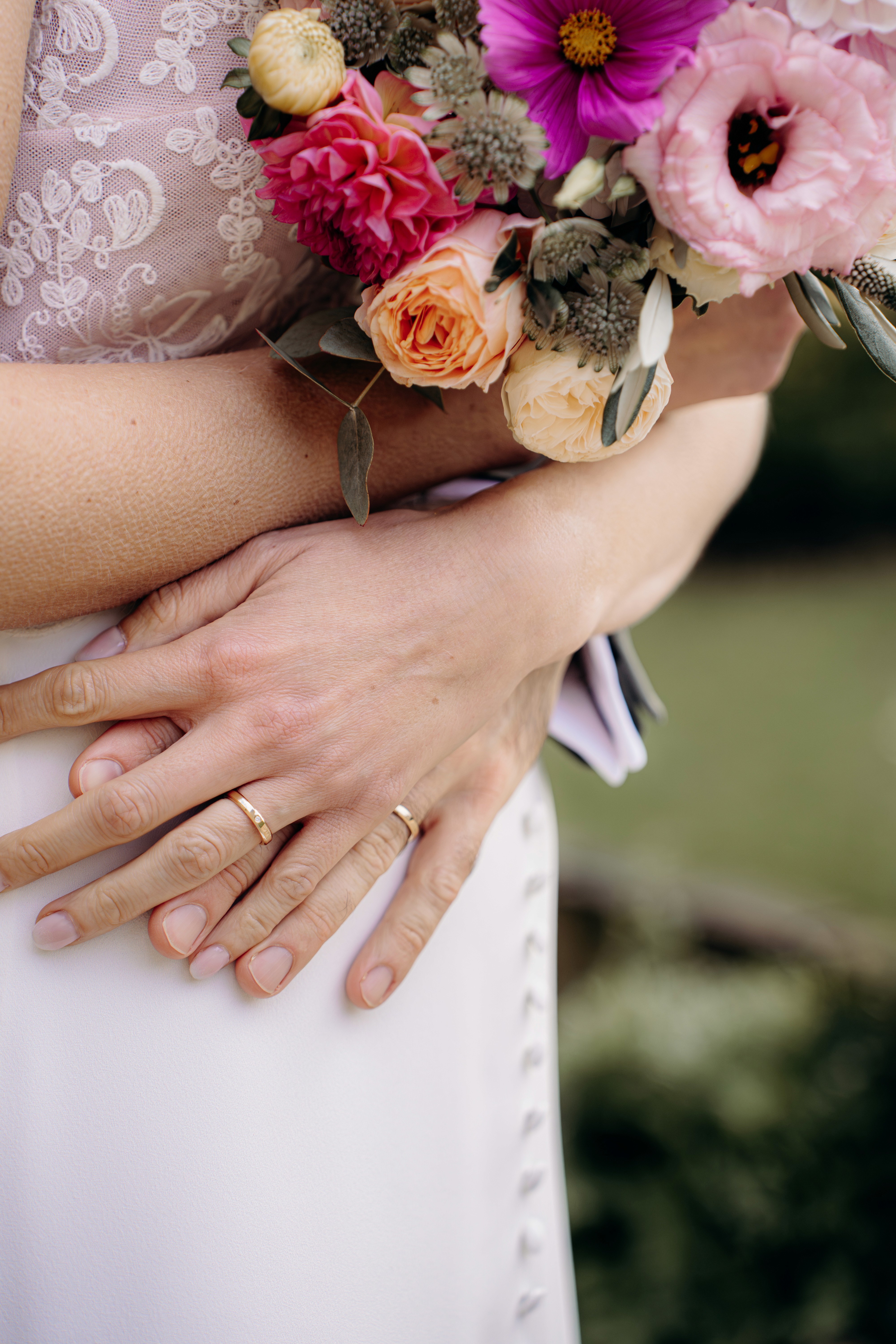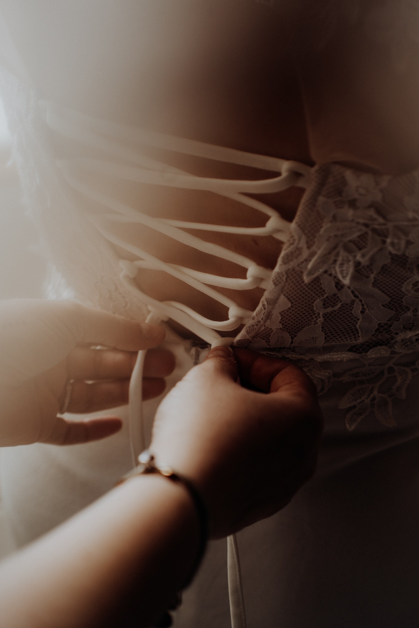 Dès les préparatifs, je m’attarde sur ce qui passe souvent inaperçu : des mains qui s’activent, un tissu qu’on ajuste, un bijou posé quelques secondes, un regard dans le miroir, la lumière qui glisse sur un détail choisi avec soin. Je photographie aussi ce qui se déroule autour de vous, sans bruit : une émotion furtive, un geste tendre, un décor qui prend forme, des éléments que vous avez pensés longtemps et qui existent enfin, l’espace d’une journée. Ce que je préfère ? Quand vous me dites que les images vous replongent dans votre journée, et qu’elles révèlent tout ce qui s’est vécu dans les marges, sans que vous en ayez pleinement conscience.